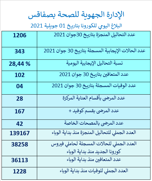 أعلنت الإدارة الجهوية للصحة بصفاقس عن تسجيل 4 وفيات و343 إصابة جديدة بفيروس كورنا.