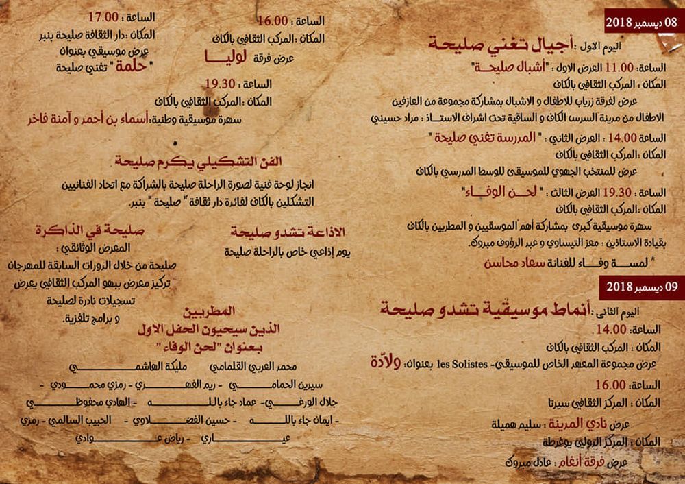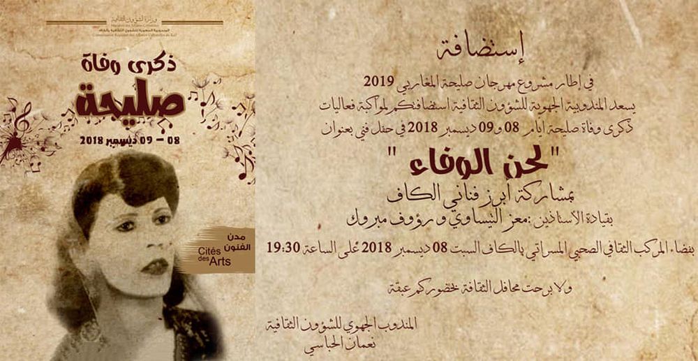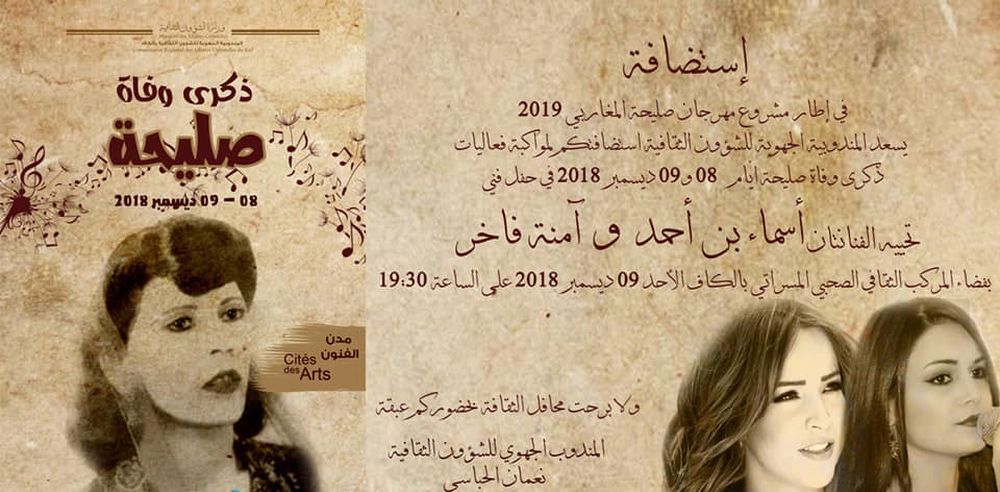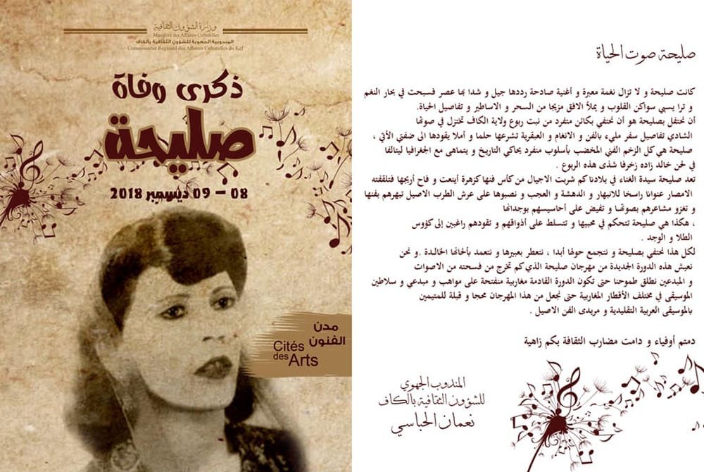 تنظم المندوبية الجهوية للشؤون الثقافية بالكاف يومي 8 و9 ديسمبر 2018 تظاهرة "صليحة صوت الحياة" والتي ستحيي من خلالها ذكرى وفاة الراحلة صليحة.