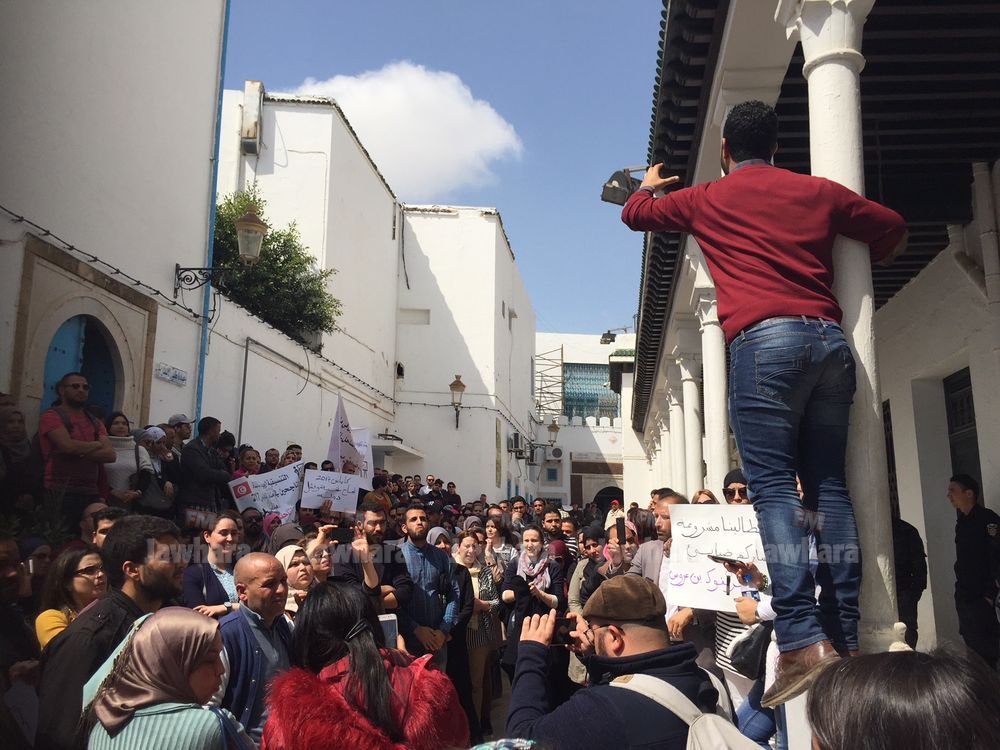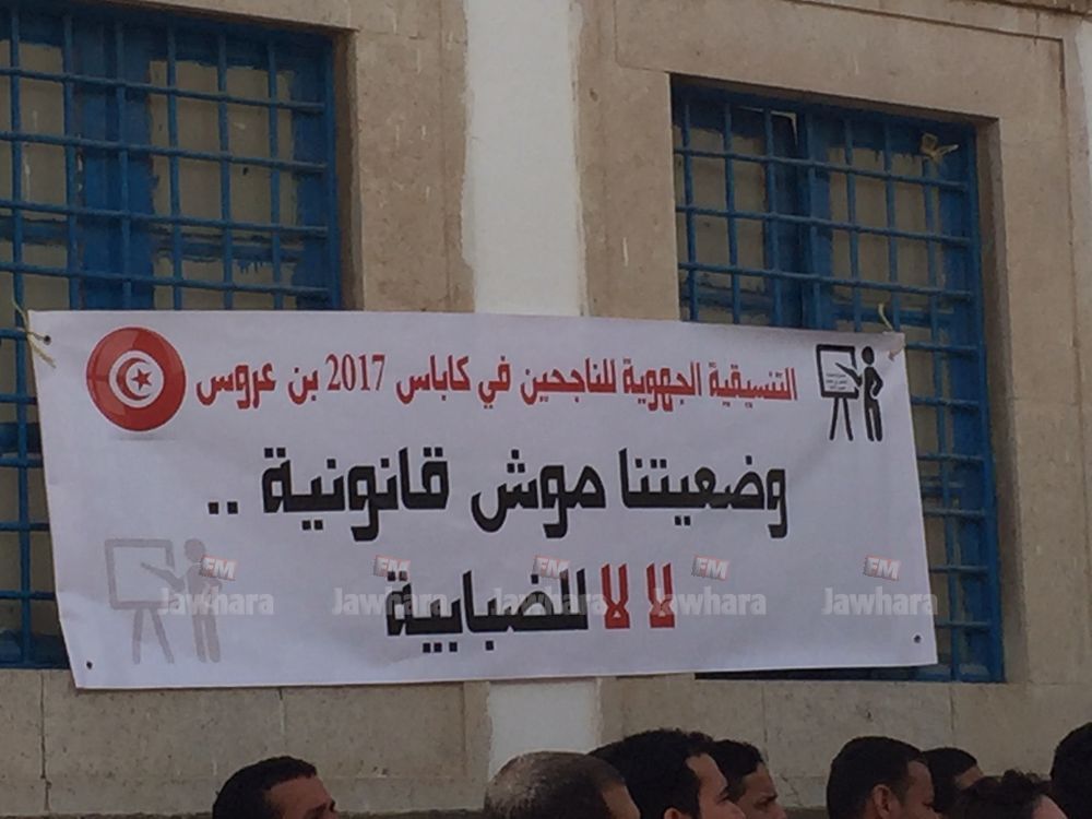نظم اليوم الخميس عدد من الأساتذة الناجحين في ما يوصف بـ "الكاباس" وقفة احتجاجية أمام مقر رئاسة الحكومة لمطالبة وزير التربية بالايفاء بتعهداته إزاء المتكونين في مجال علوم التربية وادراج القائمة بالرائد الرسمي واسداء منح تكوين للمتكونين.