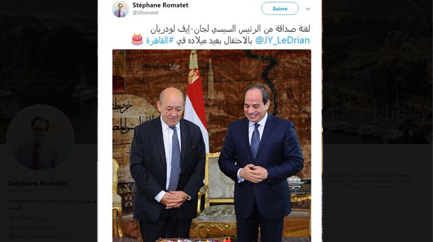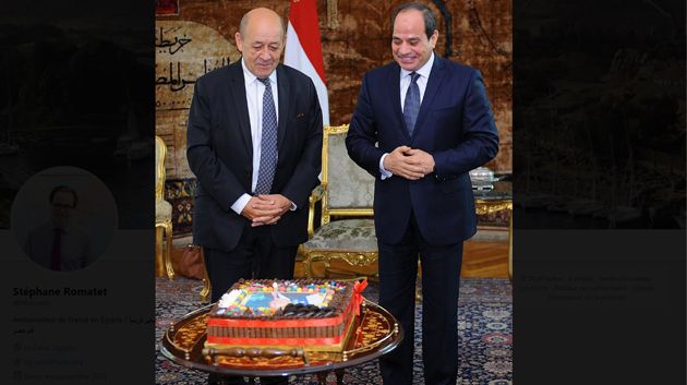 ونشر السفير الفرنسي في القاهرة، ستيفان روماتيه، عبر حسابه على تويتر، صورة لاحتفال الرئيس المصري بوزير الخارجية الفرنسي.