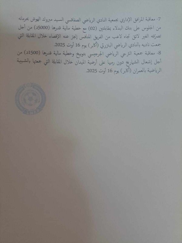 معاقبة مبروك الهوش، المرافق الإداري للنادي الصفاقسي، بـالحرمان من الجلوس على دكة البدلاء في مباراتين وخطية مالية قدرها 5000 دينار.