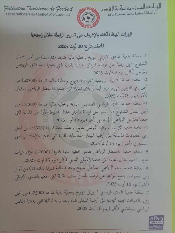 أصدرت الهيئة المكلفة بالإشراف على تسيير الرابطة الوطنية لكرة القدم المحترفة جملة من القرارات التأديبية في حق عدد من الأندية.