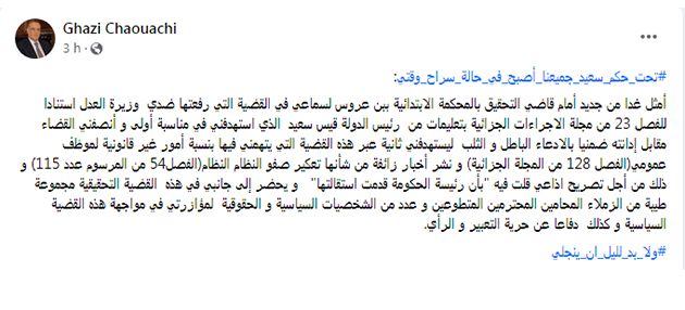 ويأتي ذلك على خلفية القضية التي رفعتها ضده وزيرة العدل بتهمة نسبة أمور غير قانونية لموظف عمومي ونشر أخبار زائفة من شأنها تعكير صفو النظام.