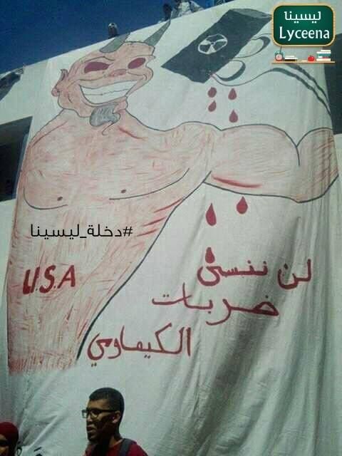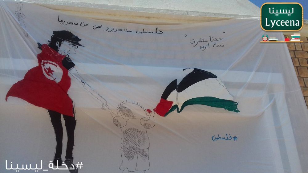 و خلال دخلة "الباك سبور" بمعهد ابن حزم ببنقردان رُفعت لافتة كبيرة كُتب عليها : "فلسطين ستُحرّر و نحن من سيحرّرها"..حتما ستشرق شمس الحرية، فيما أظهرت صور أخرى لافتة كُتب عليه :" لن ننسى ضربات الكيماوي".