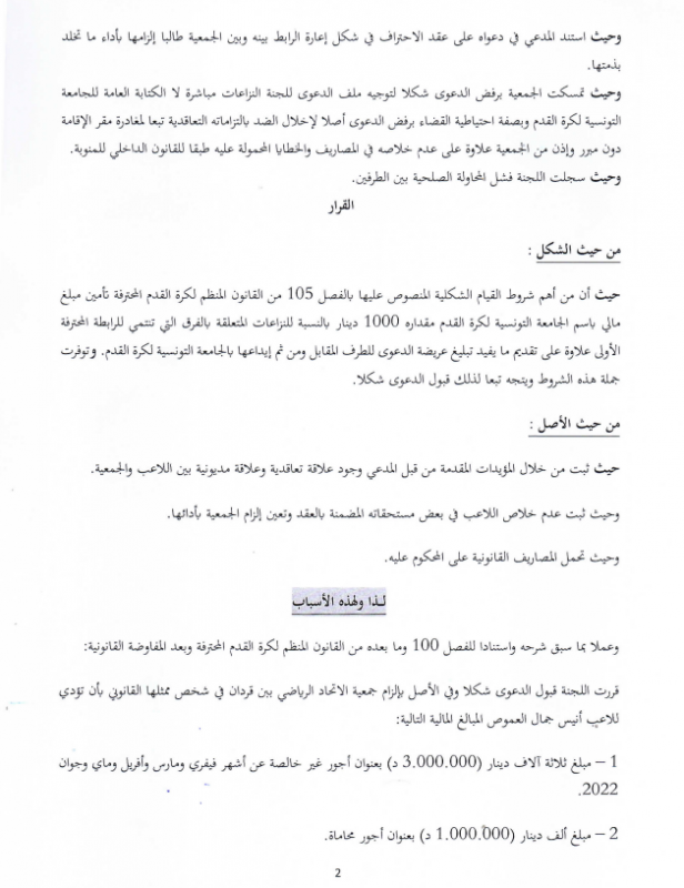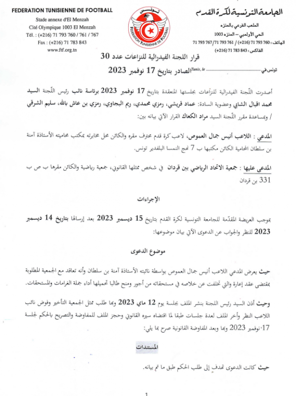 قررت اللجنة الفيدرالية للنزاعات الوطنية إلزام جمعية إتحاد بن قردان في شخص ممثلها القانوني بأن تؤدي للاعب أنيس جمال العموص المبالغ المالية التالية: