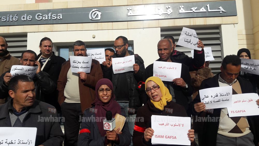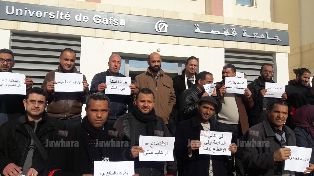 نفذ اليوم عدد من الأساتذة الجامعيين الباحثين بجامعة قفصة وقفة احتجاجية للمطالبة باحترام سلم التأجير في الوظيفة العمومية وللتعبير عن رفضهم لقرار اقتطاع يوم عمل على خلفية الإضراب الإداري الذي دعت إليه الجامعة العامة للتعليم العالي والبحث العلمي يوم 7 ديسمير 2017.