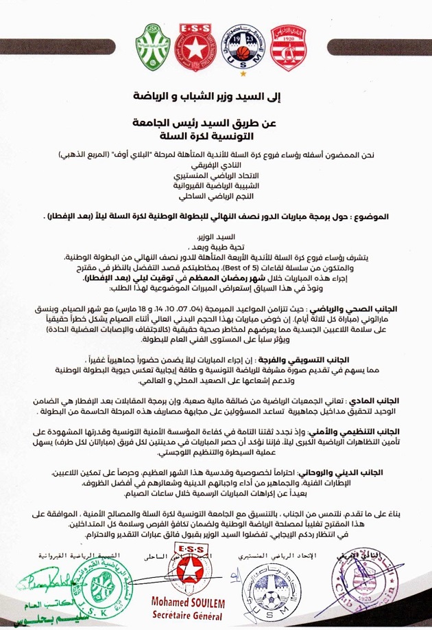 طالبت الأندية الأربعة المٌترشّحة إلى مرحلة السوبر "بلاي أوف" من بطولة كرة السلة النادي الإفريقي والاتّحاد الرياضي المنستيري والشبيبة الرياضية القيروانية والنجم الرياضي الساحلي في بلاغ مشترك وزارة الشباب والرياضة والجامعة بإجراء بقيّة مقابلات البطولة بعد الإفطار خلال شهر رمضان.