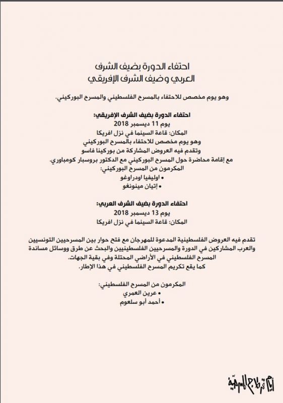 أما ضيف الشرف الإفريقي فسيكون المسرح البوركيني وتنتظم الاحتفالية الخاصة به يوم الثلاثاء 11 ديسمبر 2018 وسيتم خلالها تقديم العروض المسرحية البوركينية وتكريم كل من "أوليفيا أودراوغو" و"إتيان مينونغو"