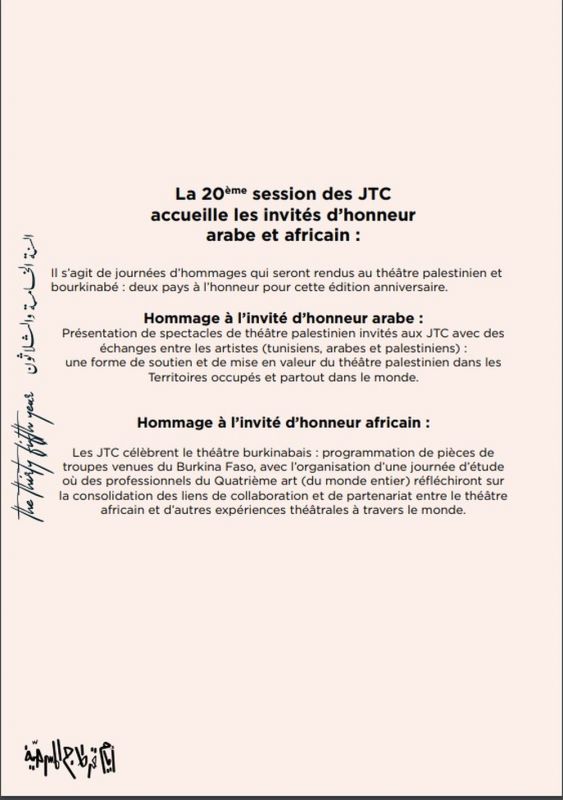 و"فلسطين" هي ضيف الشرف العربي للدورة العشرين لأيام قرطاج المسرحية، وإضافة إلى الافتتاح الفلسطيني، سيكون الموعد يوم الخميس 13 ديسمبر 2018 مع احتفالية ثانية بفلسطين سيتم خلالها تقديم العروض الفلسطينية المدعوة للمهرجان وتكريم كل من "عرين عمري" و"أحمد أبو سلعوم"