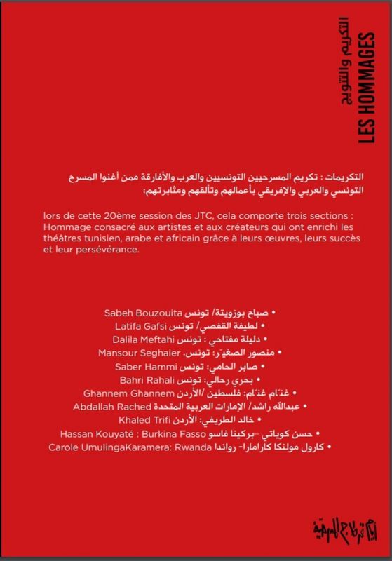 كما تكرم الدورة العشرون لأيام قرطاج المسرحية عددا من المسرحيين التونسيين والعرب والأفارقة ممن أغنوا المسرح بأعمالهم من بينهم "صباح بوزويتة"، "لطيفة القفصي"، "دليلة مفتاحي"، "منصور الصغير"، "صابر الحامي"، و"بحري الرحالي" من تونس، "غنام غنام" من فلسطين/ الأردن، "عبد الله راشد" من الإمارات العربية المتحدة، "خالد الطريفي" من الأردن، "حسن كوياتي" من بوركينا فاسو، و"كارول مولنكا كارامارا" من رواندا. كما تحيي الأيام ذكرى من فقدتهم الساحة المسرحية في الفترة الفاصلة بين الدورة الماضية والدورة الحالية لأيام قرطاج المسرحية: حاتم بالرابح، محمد البوري، خديجة السويسي، أحمد معاوية، فتحي النغموشي، ومنصف لزعر آخر المترجلين وقد وقفت الهيئة المديرة والصحافيون دقيقة صمت خلال الندوة الصحفية ترحما على روحه