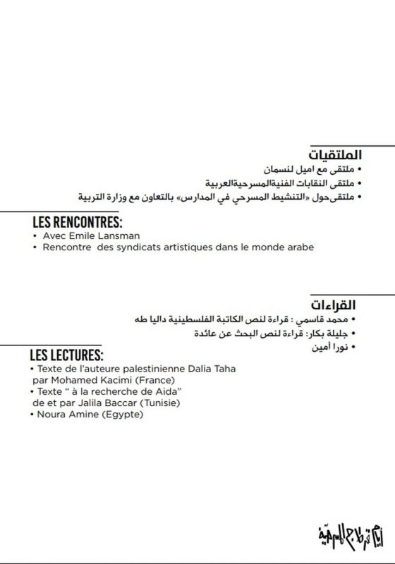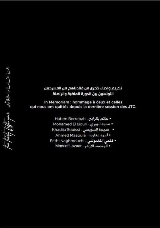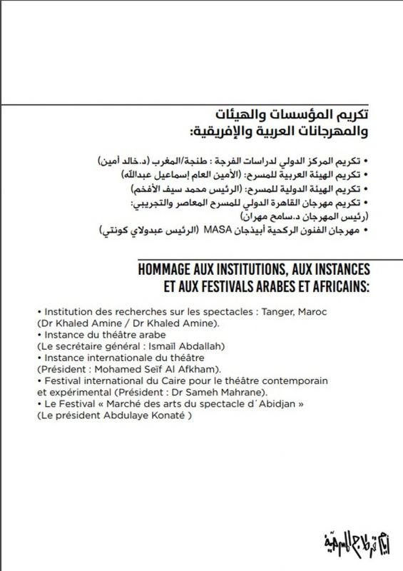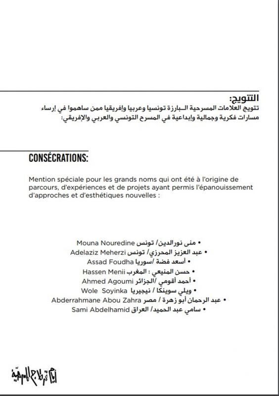 وتتويجا لعطائهم المسرحي تكرم الأيام أيضا كل من "منى نور الدين"، "عبد العزيز المحرزي" من تونس، "أسعد فضة" من سوريا، "حسن المنيعي" من المغرب، "أحمد أقومي" من الجزائر، "ويلي سوينكا" من نيجيريا، "عبد الرحمان أبو زهرة" من مصر، و"سامي عبد الحميد" من العراق