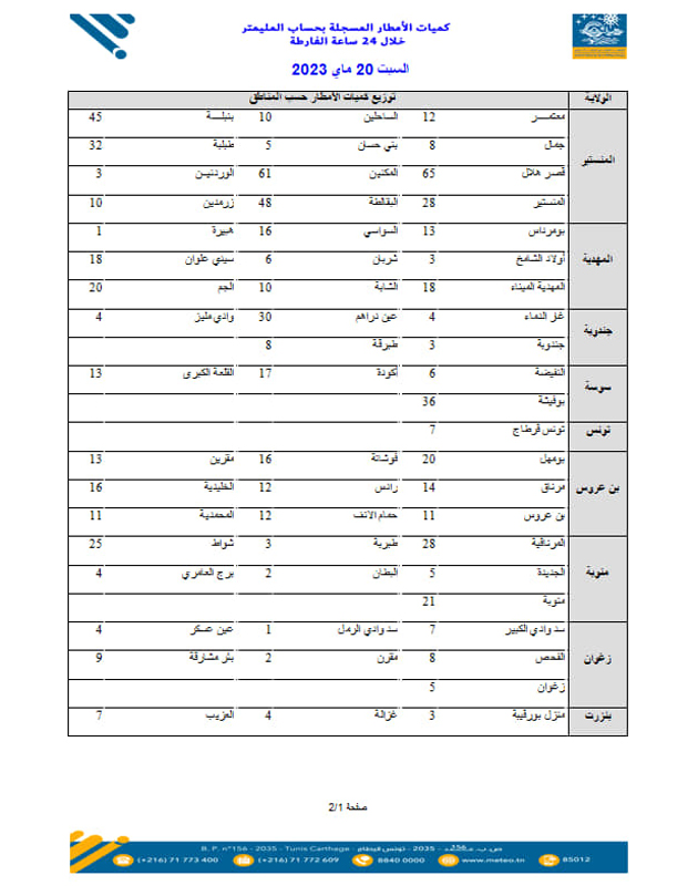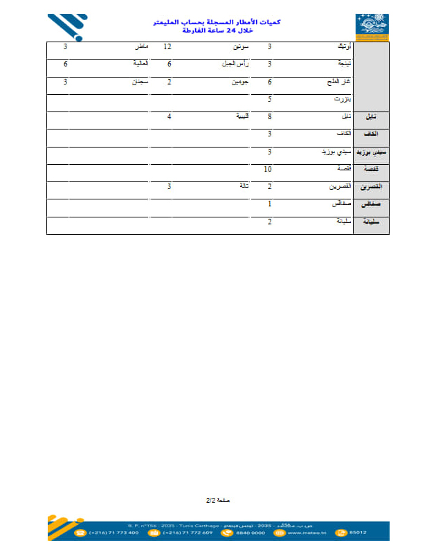 نشر المعهد الوطني للرصد الجوي كميات الأمطار المسجلة خلال الـ 24 ساعة الفارطة.