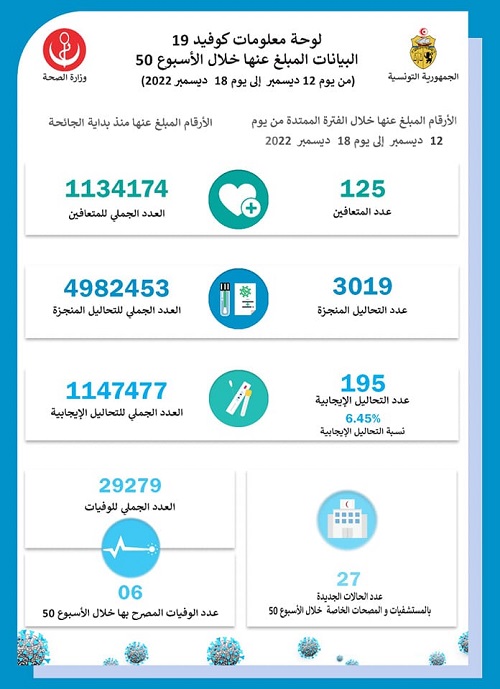 أفادت وزارة الصحة بأنه قد تم تسجيل 6 وفيات و195 إصابة جديدة بفيروس كورونا، وذلك خلال الفترة الممتدة من 12 ديسمبر إلى يوم 18 ديسمبر الحالي.