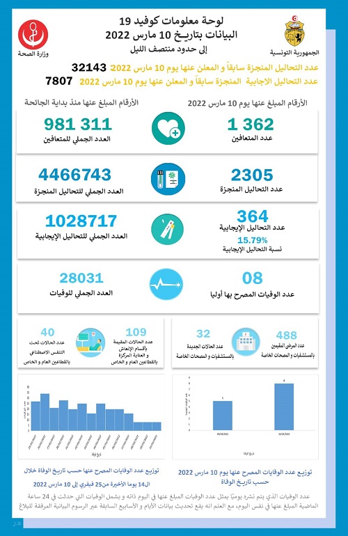 أفادت وزارة الصحة بأن عدد الوفيات الناجمة عن فيروس كورونا بلغ 8 وفيات مع تسجيل 364 إصابة جديدة وذلك بتاريخ 10 مارس 2022.