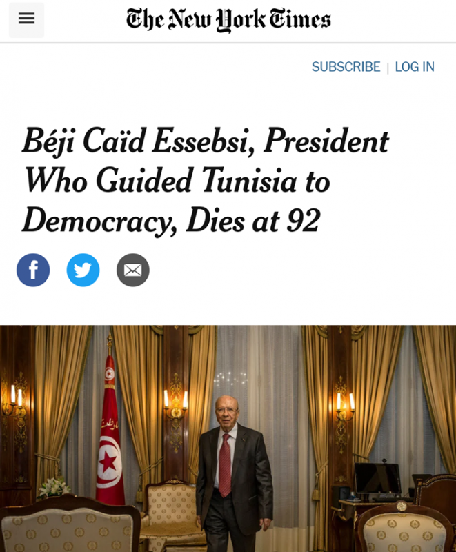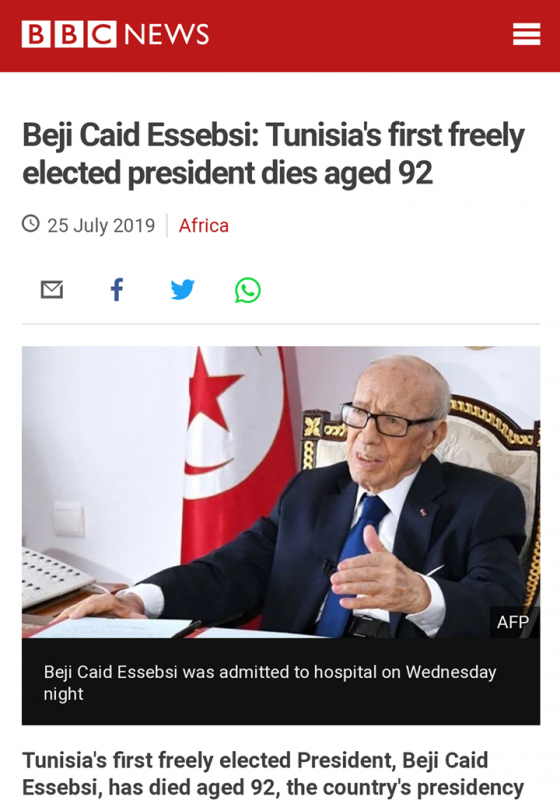 كما أعلن موقع بي بي سي عربي في خبر عاجل عن وفاة الرئيس قايد السبسي مرفوقا بنبذة عن سيرته الذاتية ثم نشر مقالا تحت عنوان "الباجي قائد السبسي وفاة اول رئيس منتخب ديمقراطيا."