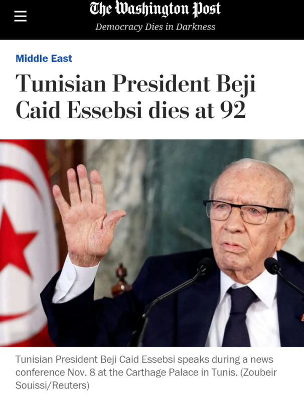 مثل رحيل رئيس الجمهورية محمد الباجي قائد السبسي يوم أمس 25 جويلية 2019 والموافق للذكرى الثانية والستون للإعلان الجمهورية حدثا بارزا في الصحافة العالمية، حيث تناولت عديد وسائل الاعلام الخبر في جل نشراتها، مبرزة اسهامات الفقيد في إنجاح الانتقال الديمقراطي في تونس .