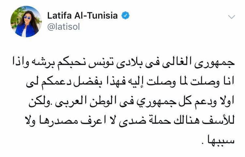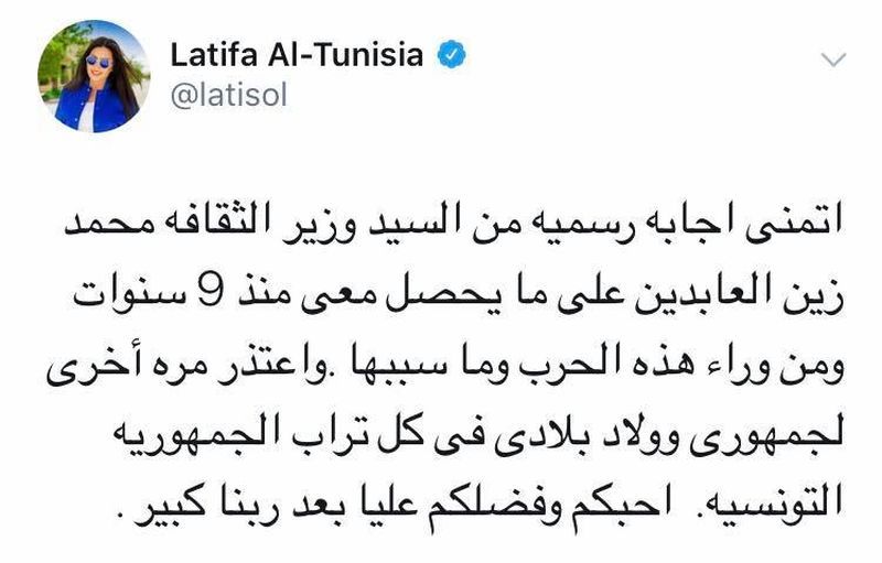 وتساءلت لطيفة عمن يقف وراء هذه "الحرب" التي حرمتها من الإلتقاء بجمهورها في تونس وطلبت من وزير الشؤون الثقافية محمد زين العابدين تمكنيها من إجابة رسمية حول من يقف وراء هذه الحملة وأسباب منعها من الغناء في تونس.