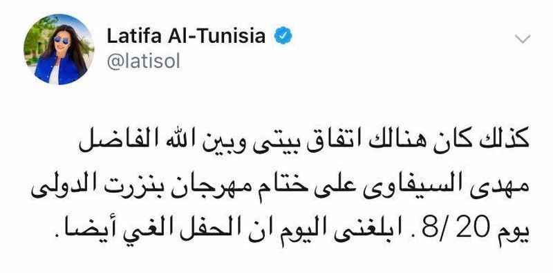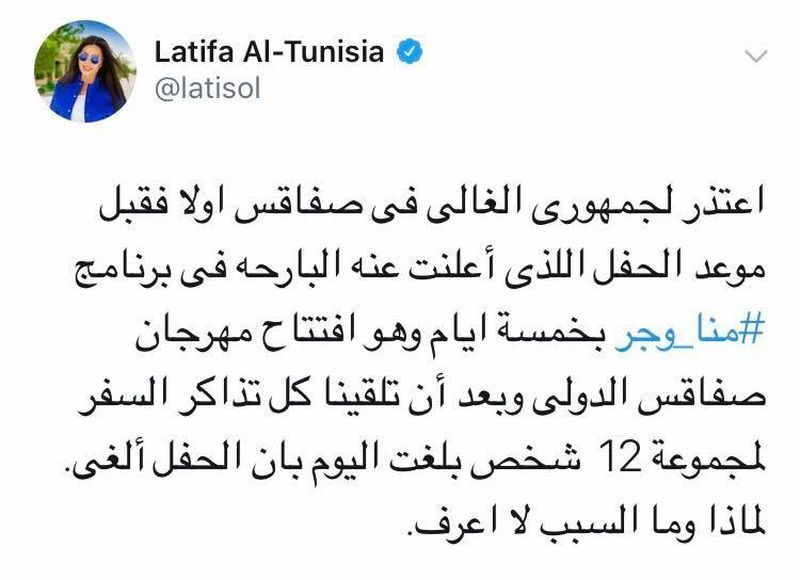 وأكدت لطيفة أنها كانت على إتفاق مع إدارة مهرجان صفاقس الدولي على إحياء حفل الإفتتاح المبرمج يوم 12 جويلية الحالي وأرفقت تغريداتها بصور تتضمن تذاكر سفر من القاهرة إلى تونس.