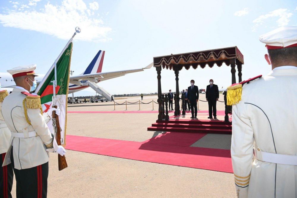 وحطّت طائرة إيمانويل ماكرون في الساعة 15,30 (14,30 بتوقيت غرينيتش) في مطار هواري بومدين بالعاصمة، حيث استقبله نظيره الجزائري عبد المجيد تبون.
