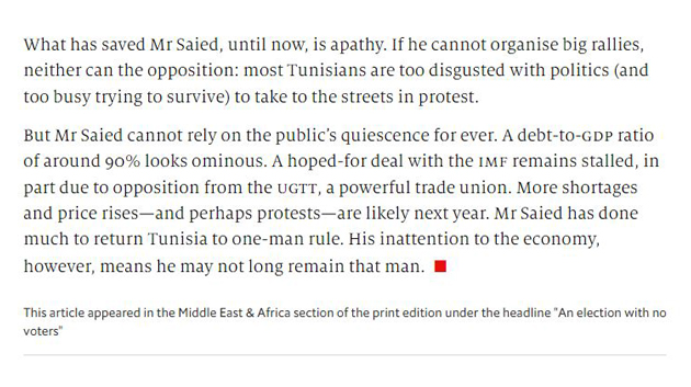 كما لم تستبعد المجلة التي تعتبر من أبرز المراجع الاعلاميّة للمؤسسات الدولية المالية، احتمال اندلاع احتجاجات في تونس نتيجة هذا الوضع، معتبرة أن الرئيس قيس سعيّد لم يولي أهمّية للاقتصاد، وفق ترجيحها في افتتاحيتها.