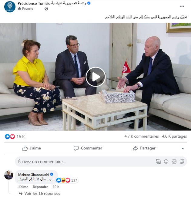 دعا المهندس بالمعهد الوطني للرصد الجوي محرز الغنوشي رئيس الجمهورية لزيارة المعهد، وذلك في تعليق على فيديو زيارة رئيس الجمهورية لمقر البنك الوطني الفلاحي، نُشر على الصفحة الرسمية لرئاسة الجمهورية على موقع الفايسبوك.