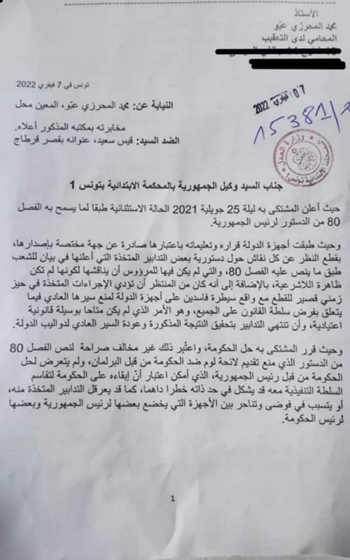 نشر الناشط السياسي محمد عبو,اليوم الاثنين نص شكاية تقدم بها ضد رئيس الجمهورية قيس سعيد مطالبا وكيل الجمهورية بتطبيق القانون دون أي حساب آخر و أن يترك لغيره القيام بواجبه أو الامتناع عنه حتى يأتي وقت الحساب وفق قوله.