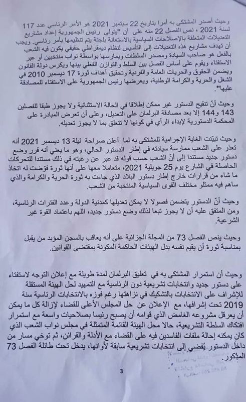 و تابع محمد عبو في تدوينة نشرها مرفوقة بنص الشكاية قوله "الذين صدقوا أن حل المجلس الأعلى للقضاء سيصلح القضاء في حين أن قيس سعيد لم يحل إلى المجلس عن طريق التفقدية ملفات فساد قضاة وقائمة ممتلكاتهم التي قال منذ يومين في وزارة الداخلية أنه والداخلية يعرفانها، هم نموذج للمواطنين الذين يصدقون أي شيء والذين يصوتون منذ سنوات لكل أصناف المتحيلين ثم يشتكون من التخلف والفقر والبطالة وانتهاكات الحقوق".