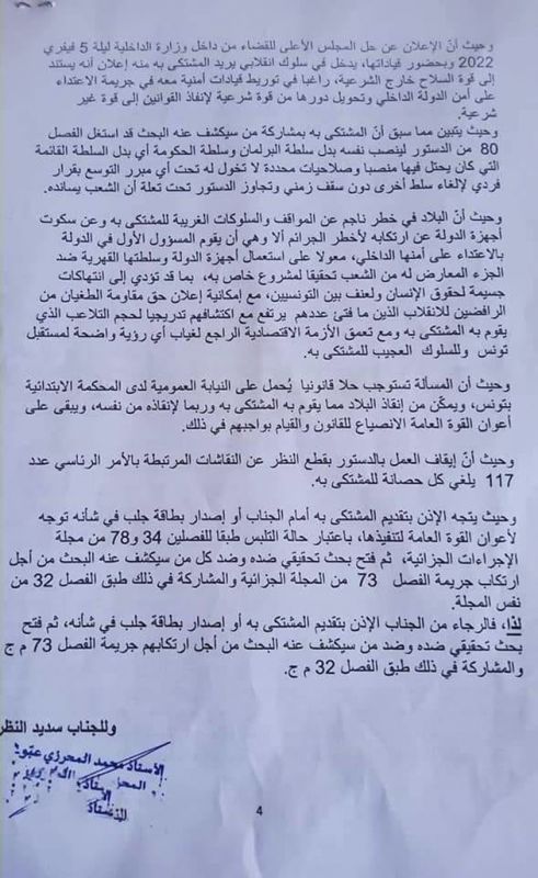 ودعا عبو وكيل الجمهورية إلى الإذن بتقديم المشتكى به أو اصدار بطاقة جلب في شأنه ثم فتح بحث تحقيقي ضده وضد كل سيكشف عنه البحث.