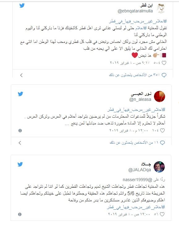 و دشن ناشطون قطريون هاشتاغ بعنوان "أحلام_غير_مرحب_فيها_في_قطر" استنكروا فيه دعوة أحلام لإقامة العرس مشيدين في نفس الوقت بموقف المدعويين الذي غادروه لغيرتهم على وطنهم وقيادته.