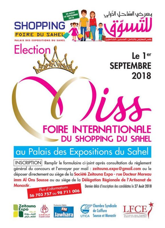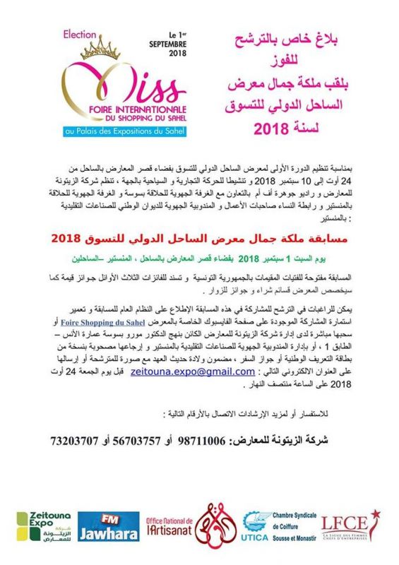 يشترك كل من الزيتونة للمعارض ، و"الجوهرة أف أم" والديوان الوطني للصناعات التقليدية بالمنستير والغرفة الجهوية للحلاقة بالمنستير وسوسة ورابطة النساء صاحبات الأعمال بالمنستير والإتحاد الوطني للمرأة والغرفة الجهوية للتكوين بالمنستير في تنظيم مسابقة ملكة جمال معرض الساحل الدولي للتسوق.