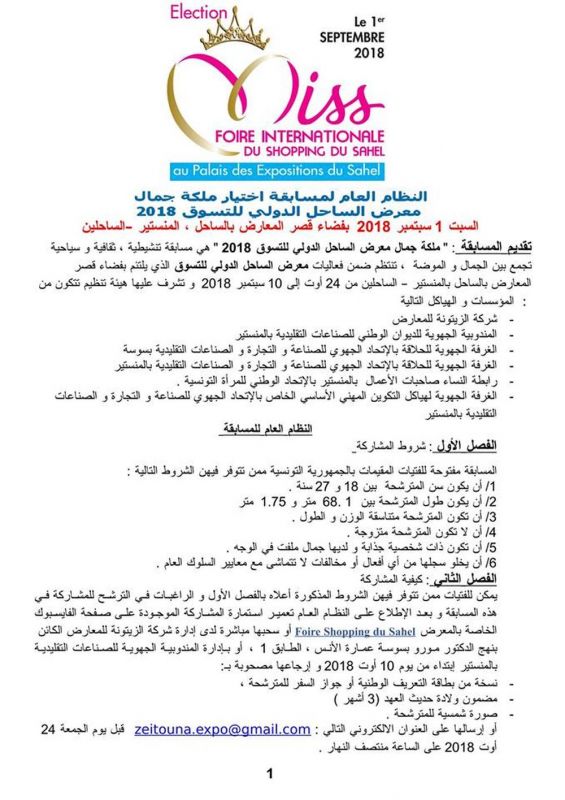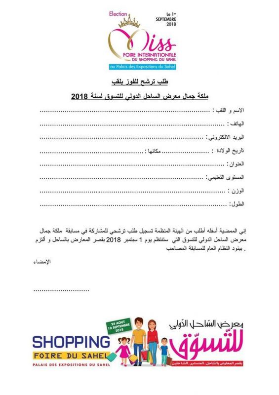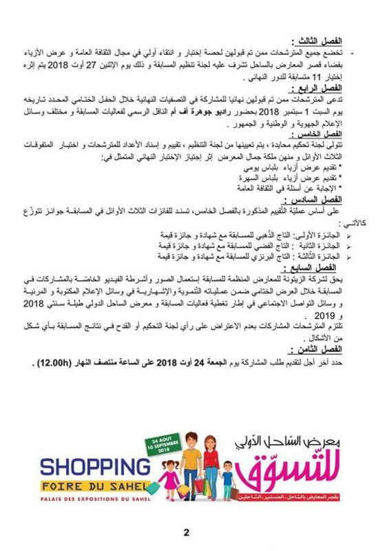 وستتنافس الجميلات على الفوز بلقب ملكة جمال معرض الساحل الدولي للتسوق يوم 1 سبتمبر 2018 بفضاء قصر المعارض بالساحل بحضور لجنة تحكيم من الأخصائيين في الجمال و الثقافة حيث ستسند جوائز هامة للفائزات وسط حضور اعلامي مكثف. وينشط الحفل مجموعة من الفنانين برعاية "الجوهرة أف أم".