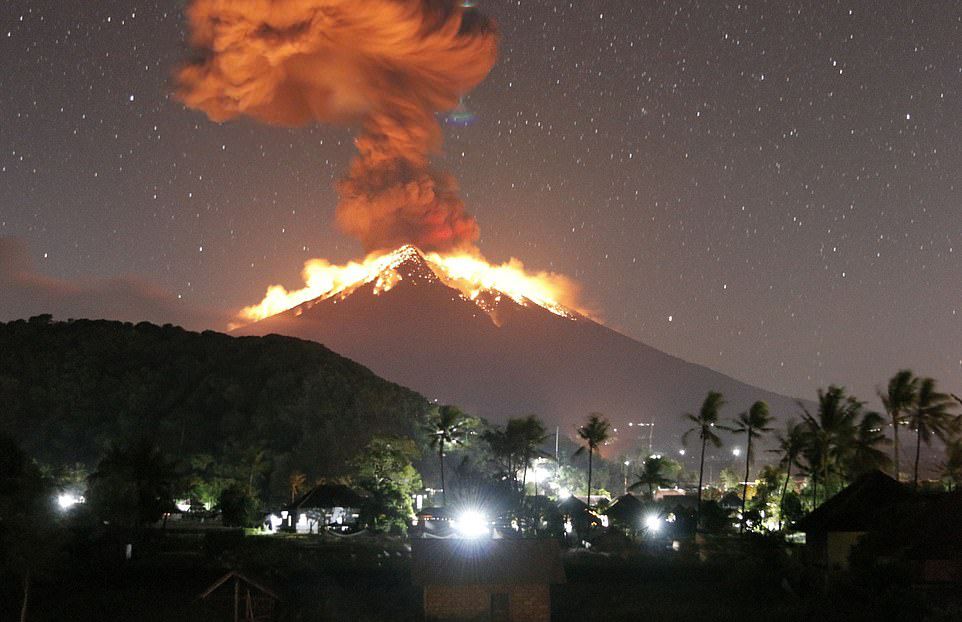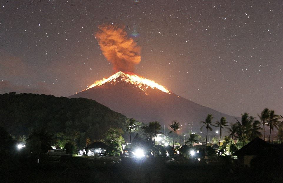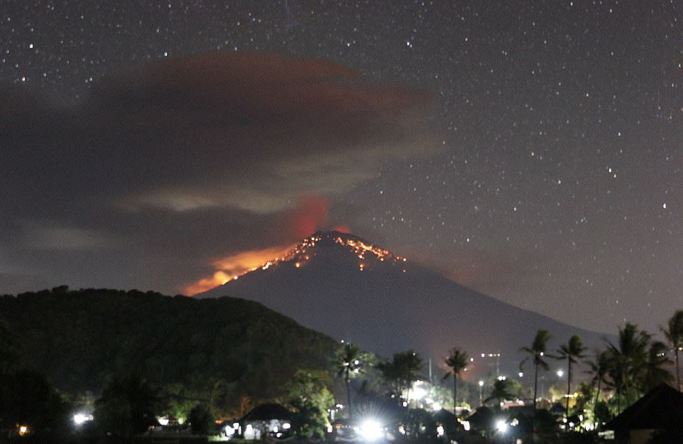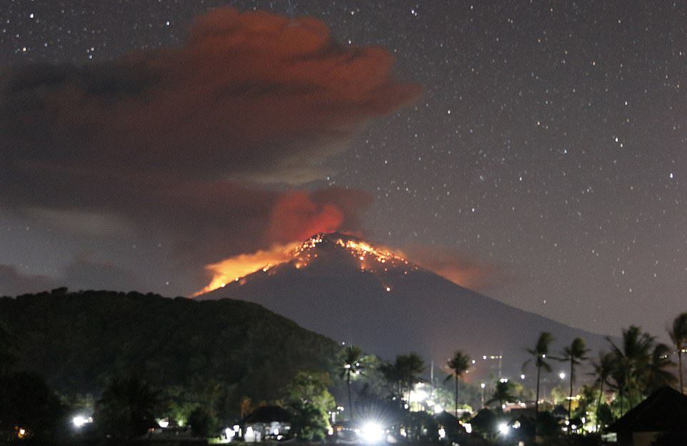 وأظهرت صور التقطت لبركان جبل "أغونغ" خلال الليل، عمودا من الرماد وحمما متوهجة عند فوهة البركان. ويقع جبل أغونغ في شرق بالي ويصل ارتفاعه إلى ما يزيد قليلا عن ثلاثة آلاف متر.