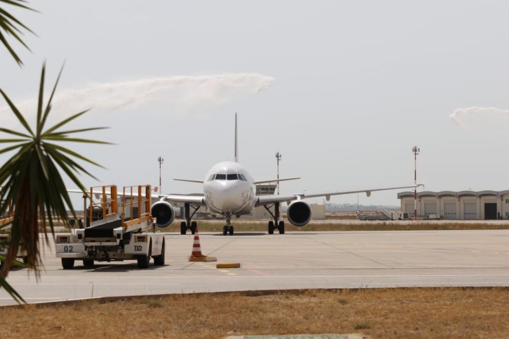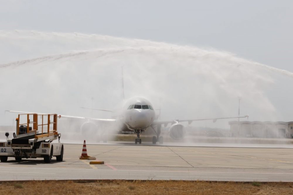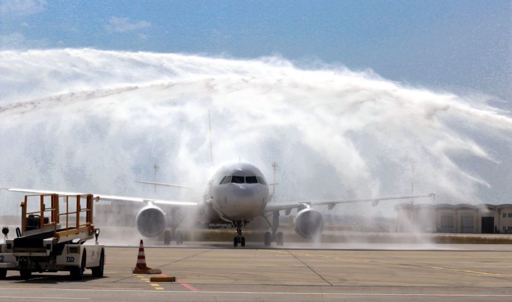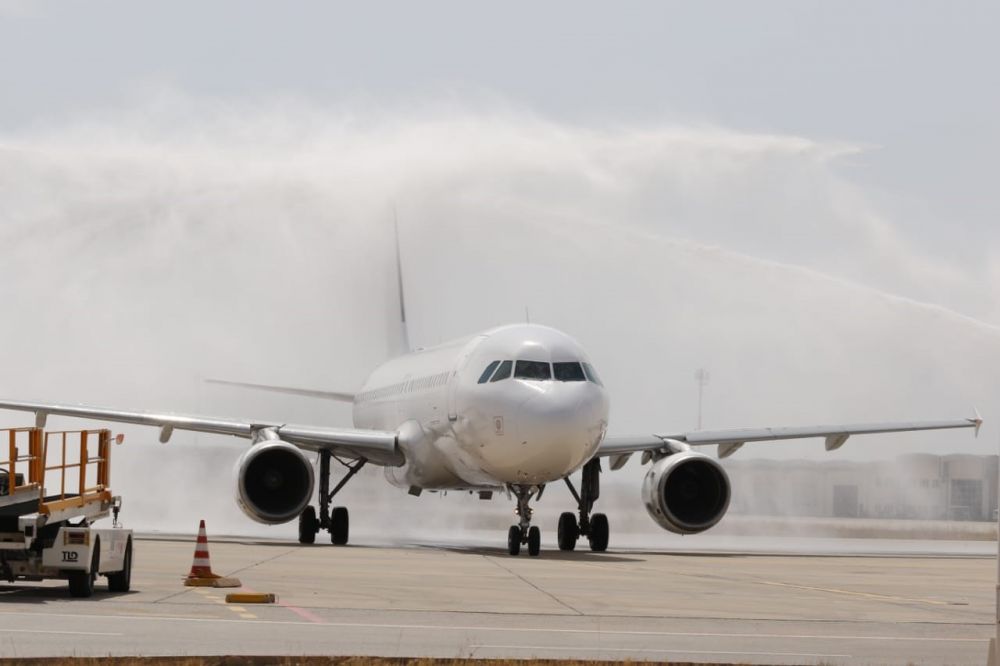 وتمّ استقبال الطائرة برش المياه، وهو تقليد معمول به في العالم، للترحيب بالطائرات التي تحط لأول مرّة في أحد المطارات.