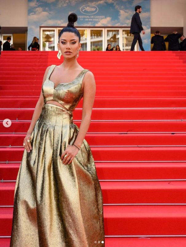 أما الممثلة اللبنانية سينتيا خليفة تألقت خلال ظهورها على البساط الأحمر للمهرجان بثوب ذهبي اختارته من Karoline Lang ونسّقته مع مجوهرات ماسيّة.