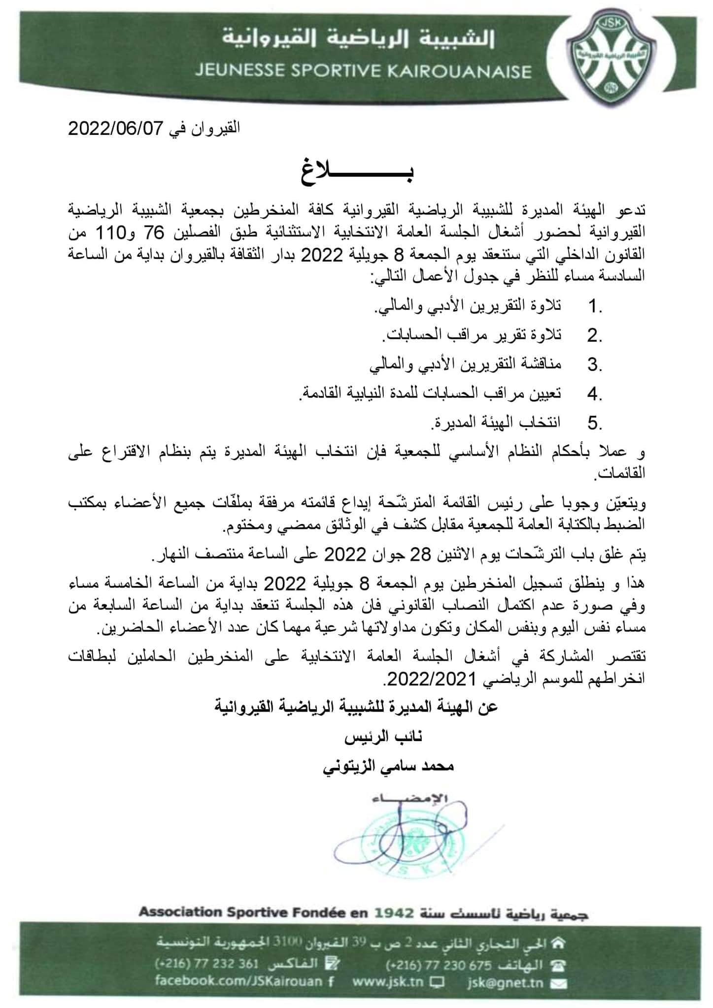 أصدرت الهيئة المديرة للشبيبة الرياضية القيروانية بلاغا دعت فيه كافة المنخرطين بالنادي لحضور أشغال الجلسة العامة الانتخابية الاستثنائية و التي ستنعقد يوم الجمعة 8 جويلية 2022 بدار الثقافة بالقيروان بداية من الساعة السادسة مساء .