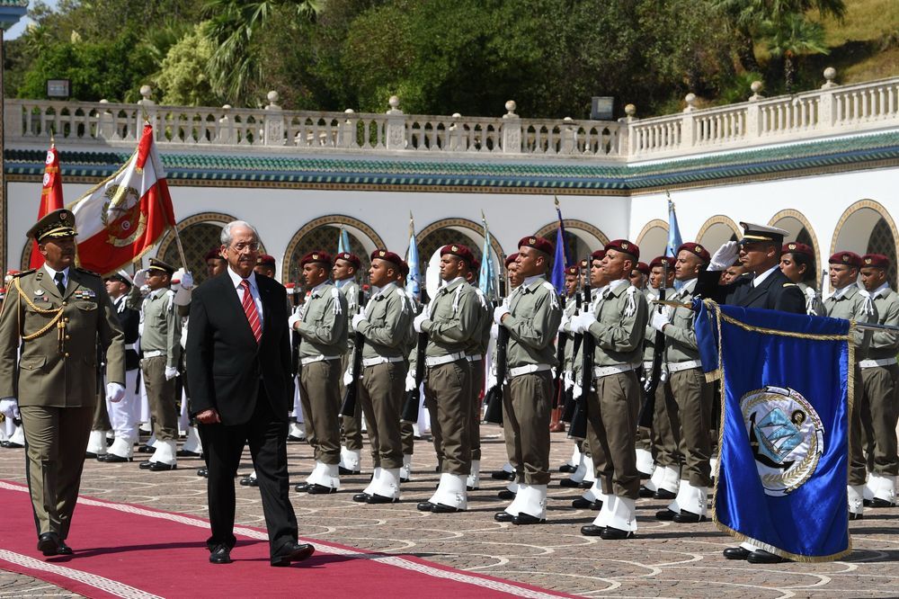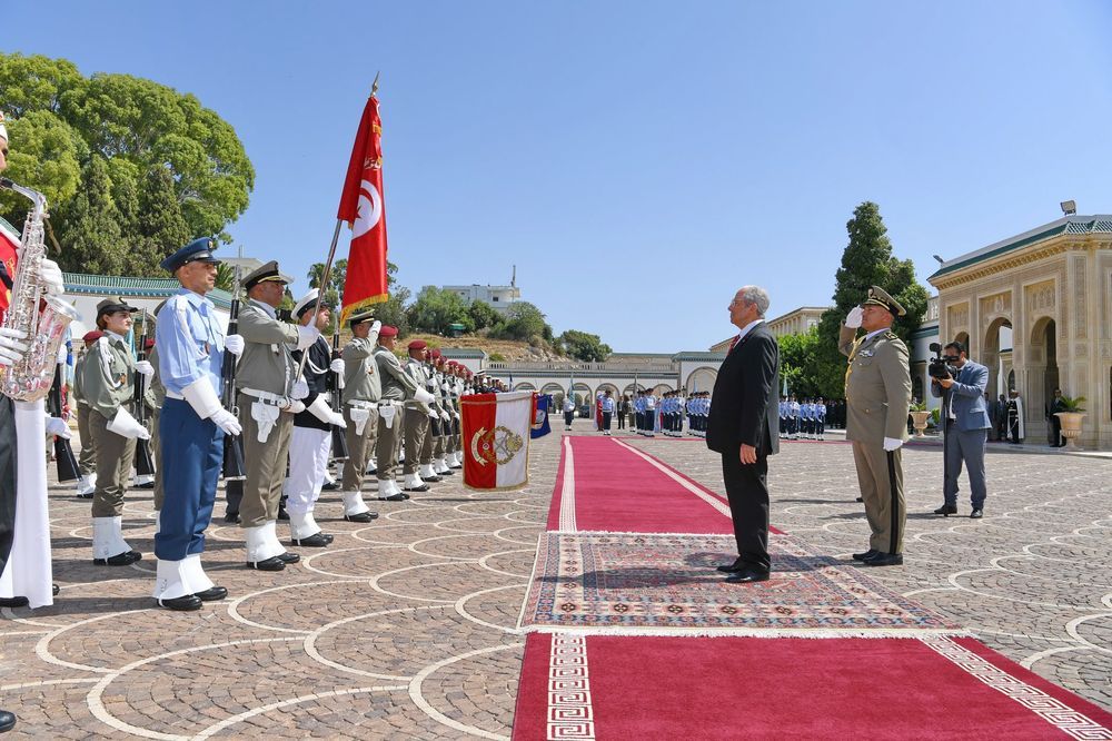 وتولّى  رئيس الدولة خلال الموكب تحيّة العلم المفدّى على أنغام النشيد الوطني وتفقّد تشكيلات من الجيوش الثلاثة.