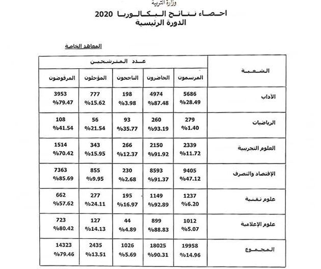 و قد نشرت الوزارة نتائج الباكالوريا المفصلة للناجحين و المؤجلين و المرفوضين في المعاهد العمومية و الخاصة وهي كالاتي :
