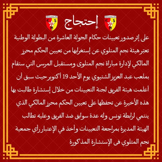 عبّرت الهيئة المديرة للنّجم الرياضي بالمتلوي عبر بلاغ رسمي عن استغرابها و تحفظها على تعيين الحكم محرز المالكي لإدارة المباراة التي ستجمع الفريق بالمستقبل الرياضي بالمرسى في إطار الجولة العاشرة لبطولة الرّابطة المحترفة الأولى المبرمجة يوم الأحد القادم، 19 أكتوبر 2025، بملعب عبد العزيز الشتيوي بالمرسى.وإليكم البلاغ كاملا :