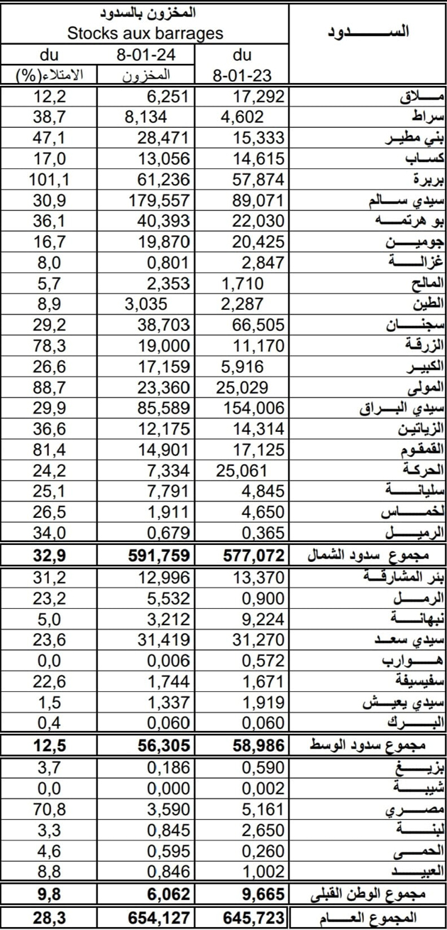 الاستقبال >أخبار >وطنية وطنية2024/01/08 11:37 Tweeter نسبة إمتلاء السدود إثر الأمطار الأخيرة أفاد المهندس بالمعهد الوطني للرصد الجوي، محرز الغنوشي، في تدوينة نشرها على صفحته الرسمية بالفيسبوك، اليوم الإثنين، بأنّ "نسبة امتلاء السدود الجملية بلغت اليوم 28.3 %، مُشيرًا إلى أنّه "بالنسبة لسدود الشمال فقد بلغت 33 %".