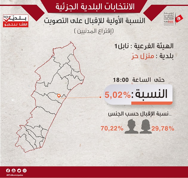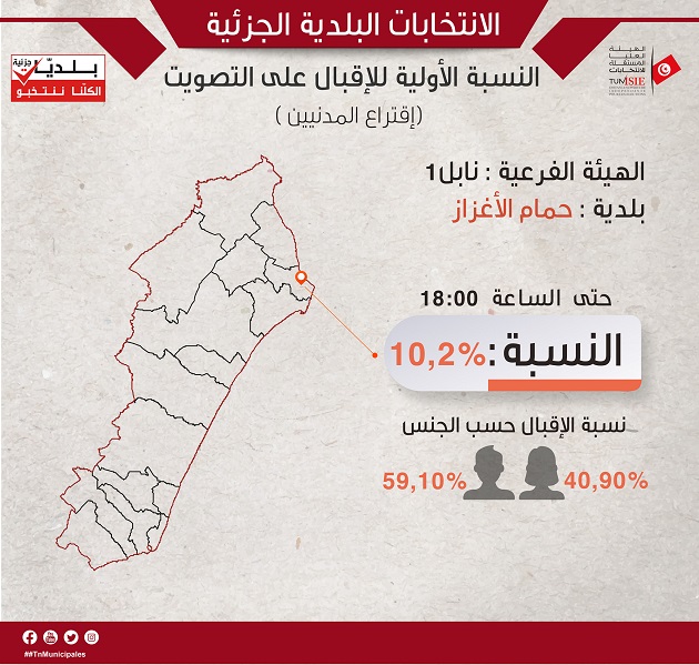 نسبة الإقبال على الاقتراع في الانتخابات البلدية الجزئية بكل من بلدية حمام الغزاز وبلدية منزل الحر