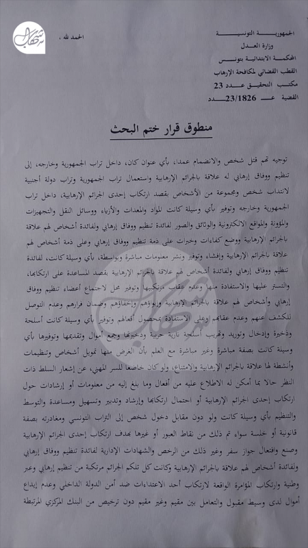 ووفق القرار فقد تقرر إحالتهم إلى مع ملف القضية إلى دائرة الاتهام بالقطب القضائي لمكافحة الإرهاب بمحكمة الاستئناف في تونس لتقرر في شأنهم ما تراه.