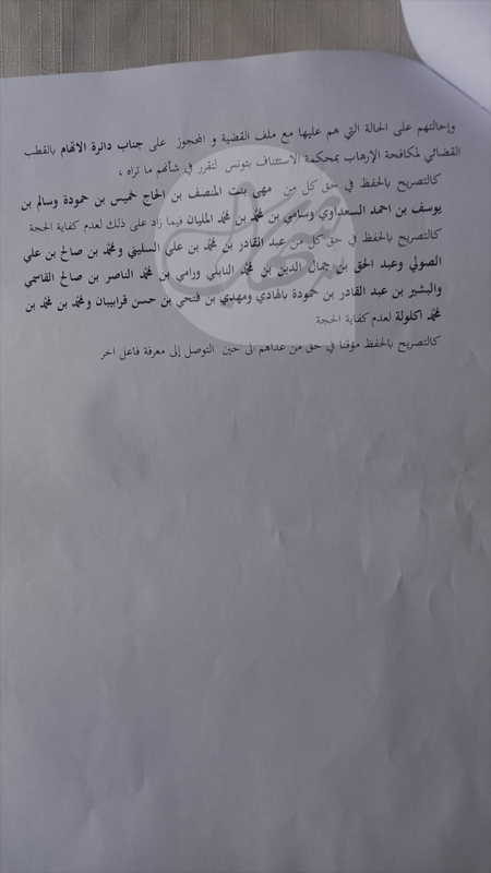 كما أمرت بحفظ القضية في حق 7 تونسيين آخرين لعدم كفاية الحجة، وهم عبد القادر السليني، ومحمد الصولي، وعبد الحق النابلي، ورامي القاسمي، والبشير بالهادي، ومهدي قرابيبان، ومحمد اكلولة.