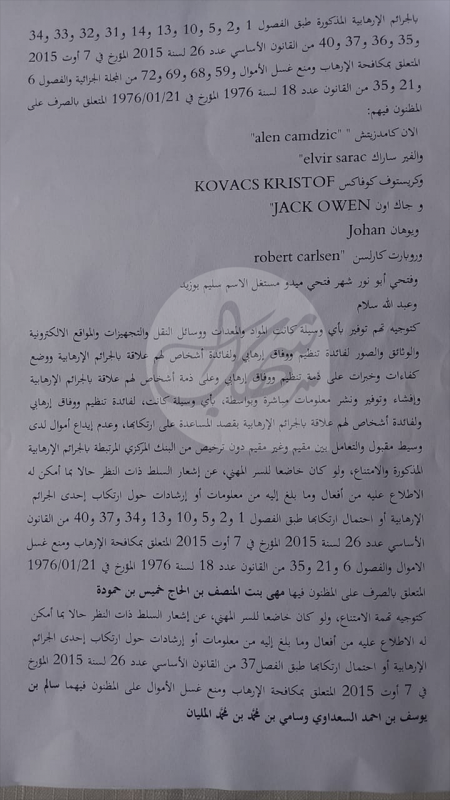 أما المتهمين التونسيين الآخرين، سالم بن يوسف أحمد السعداوي، وسامي بن محمد المليان، فتم توجيه تهم، الامتناع ولو كان خاضعا للسر المهني عن إشعار السلطات ذات النظر حالا بما أمكن له الاطلاع عليه من أفعال وما بلغ من معلومات أو إرشادات حول ارتكاب إحدى الجرائم الإرهابية أو احتمال ارتكابها وفق الفصل 37 من القانون الأساسي المتعلق بمكافحة الإرهاب ومنع غسل الأموال.