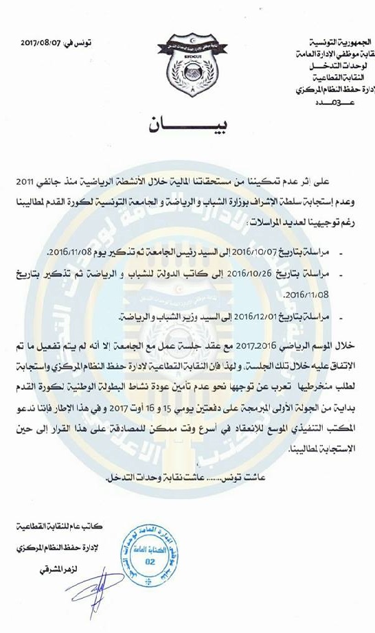 أعربت نقابة موظفي الإدارة العامة لوحدات التدخل في بلاغ أصدرته اليوم عن التوجه نحو عدم تأمين عودة نشاط البطولة الوطنية لكرة القدم بداية من الجولة الأولى المبرمجة على دفعتين يومي 15 و16أوت 2017 وذلك إستجابة لطلب منخرطيها بعد عدم حصولهم على المستحقات المالية خلال الأنشطة الرياضية منذ شهر جانفي 2011 وعدم إستجابة الجامعة التونسية لكرة القدم و وزارة الشباب والرياضة لمطالبهم .