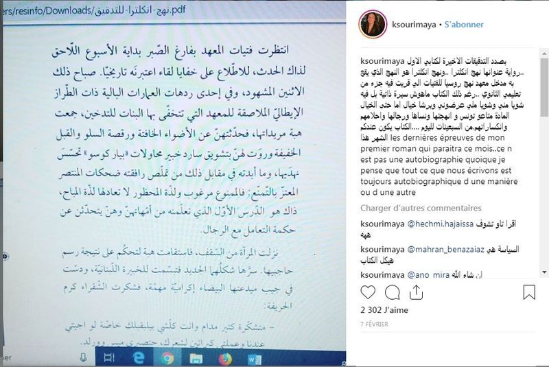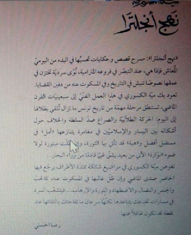 وجاء في تدوينة الكسوري : "بصدد التدقيقات الاخيرة لكتابي الاول ..رواية عنوانها نهج انكلترا ..ونهج انكلترا هو النهج الذي يقع به مدخل معهد نهج روسيا للفتيات الي قريت فيه جزء من تعليمي الثانوي ..رغم ذلك الكتاب ماهوش سيرة ذاتية بل فيه شويا مني وشويا ملي عرضوني وبرشا خيال اما حتى الخيال المادة متاعو تونس و انهجتها ونساها ورجالها واحلامهم وانكساراتهم.من السبعينات لليوم ….الكتاب يكون عندكم الشهر هذا."