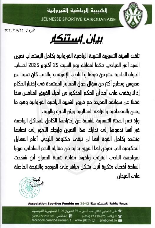 عبّرت الهيئة التسييرية للشبيبة الرياضية القيروانية عن استغرابها الشديد من تعيين الحكم أمير العيادي لإدارة مباراة الفريق ضد النادي الإفريقي يوم السبت 25 أكتوبر 2025 لحساب الجولة الحادية عشرة من البطولة.الشبيبة القيروانية دعت إلى تدارك هذا التعيين وإعادة الأمور إلى نصابها.