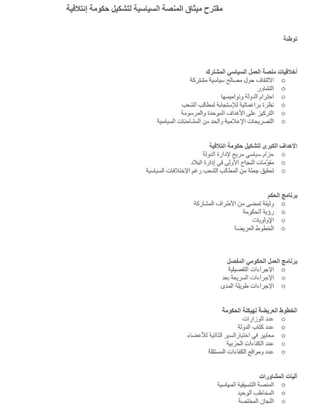 وتُوزّع الوثيقة على الأحزاب والأطراف السياسية المشاركة في المشاورات وجاءت هذه الوثيقة تحت عنوان "ميثاق المنصة السياسية لتشكيل حكومة إئتلافية".