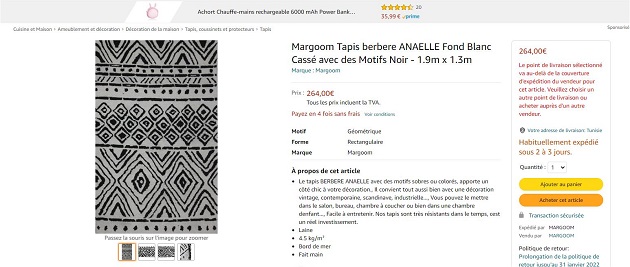 نشرت وزارة السياحة صورة لأول زربية تونسية يتم ترويجها وبيعها على منصة التسويق الالكتروني العالمية "AMAZON".