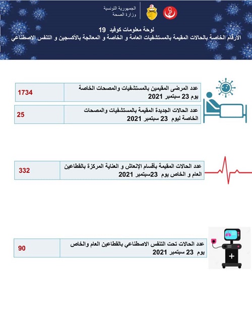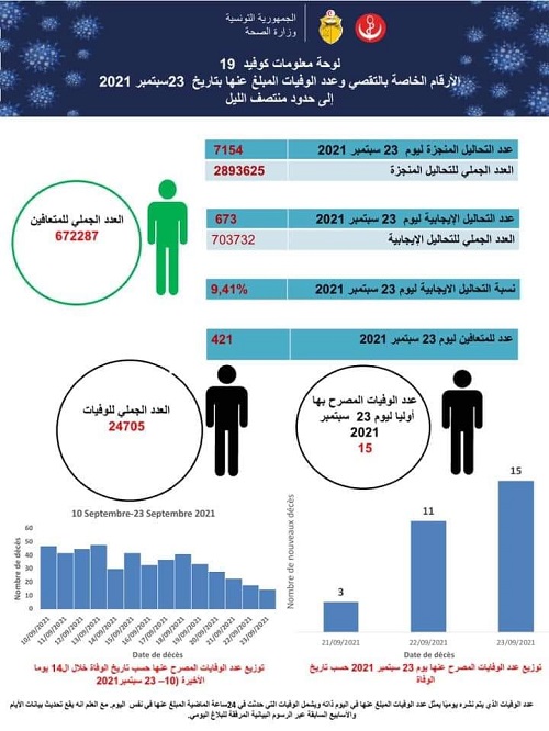 أفادت وزارة الصحة بأن عدد الوفيات الناجمة عن فيروس كورونا المصرّح بها بتاريخ 23 سبتمبر الحالي، بلغ 15 حالة ليرتفع بذلك العدد الجملي للوفيات، منذ بداية انتشار الوباء، إلى 24705 حالة وفاة.