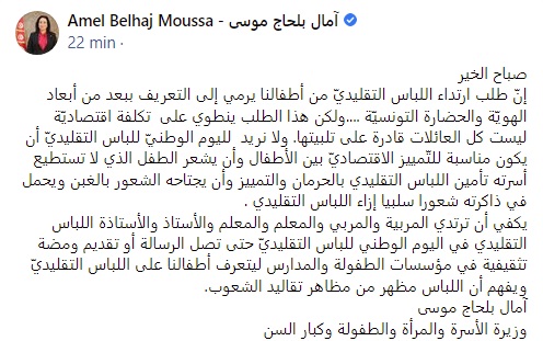 وأضافت في تدوينة نشرتها على صفحتها الرسمية بالفايسبوك: أن "طلب ارتداء اللباس التقليديّ من أطفالنا يرمي إلى التعريف ببعد من أبعاد الهويّة والحضارة التونسيّة، ولكن هذا الطلب ينطوي على تكلفة اقتصاديّة ليست كل العائلات قادرة على تلبيتها".